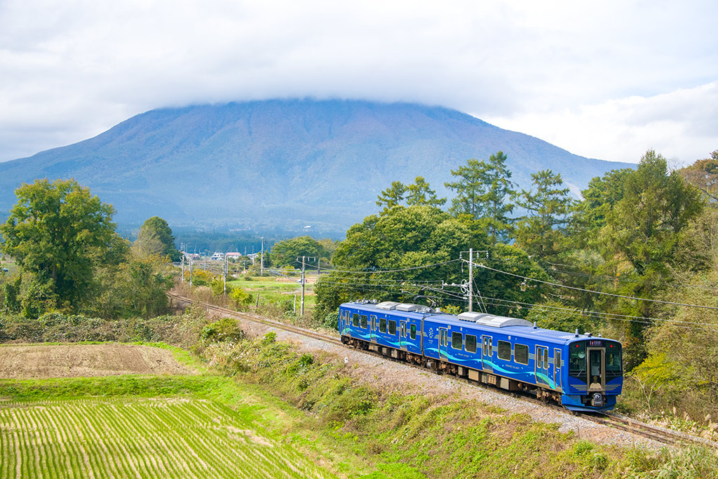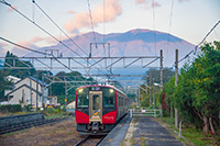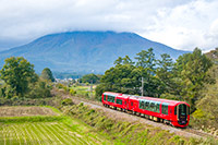 浅間山に背景に走るえちごトキめき鉄道ET122形1000番台気動車(えちごトキめきリゾート雪月花)による団体臨時列車(信秋コース)