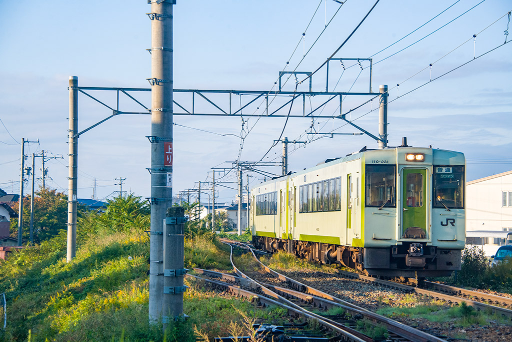 第1飯山街道踏切にて撮影のJR東日本キハ110系車両による(飯山線直通)下り列車(127D)