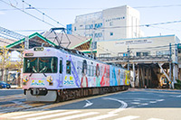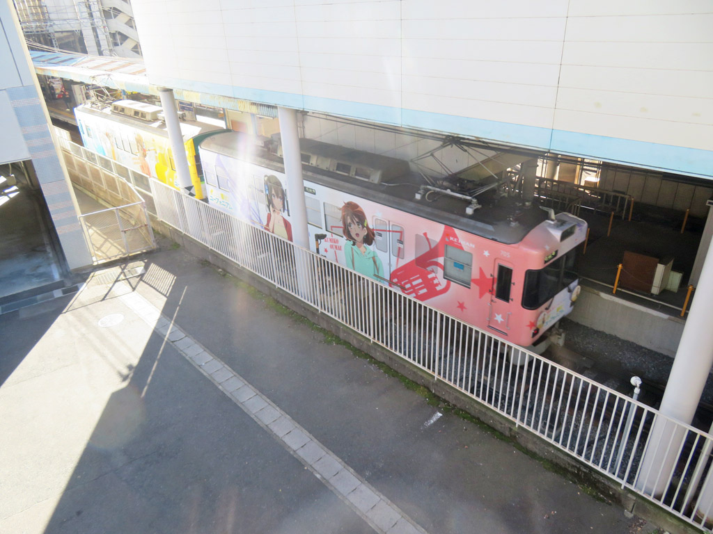 びわ湖浜大津駅を出発する700形車両(705-706号車)による『京阪電車×響け!ユーフォニアム 2025』ラッピング電車(1083)、同の