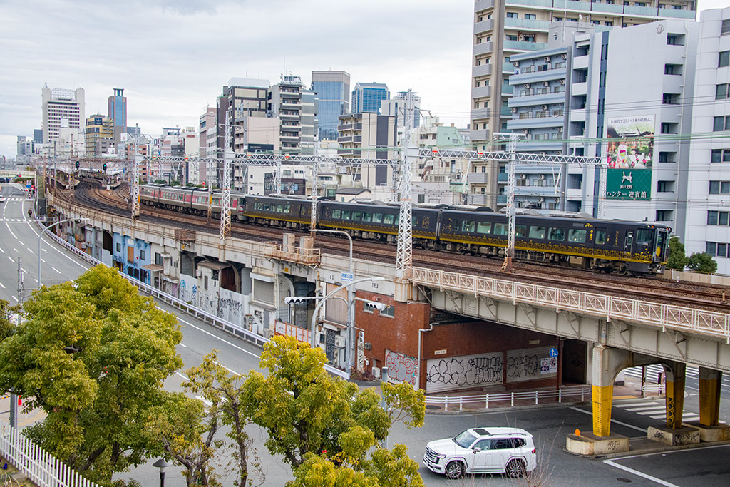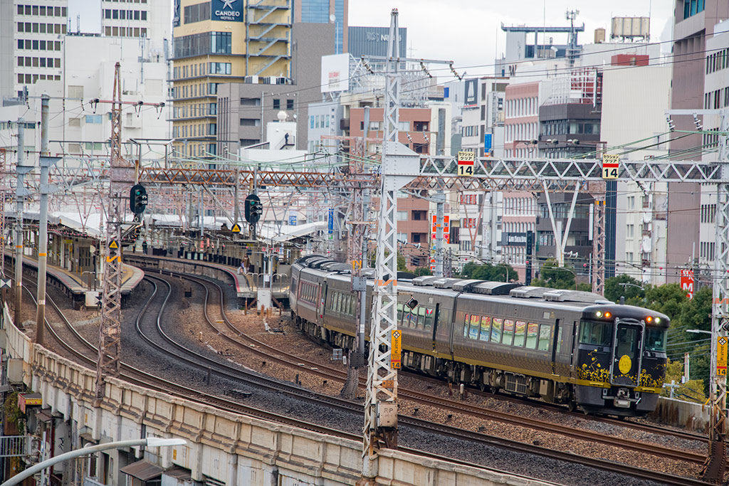 花隈公園より撮影のキロ189系気動車による観光列車「はなあかり」併結キハ189系気動車による特急かにカニはまかぜ(8091D)、同の