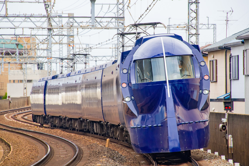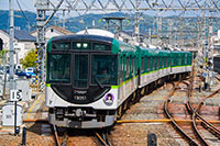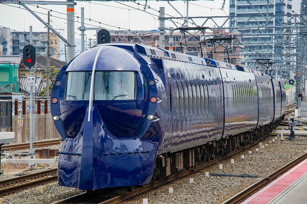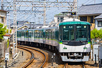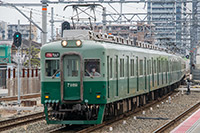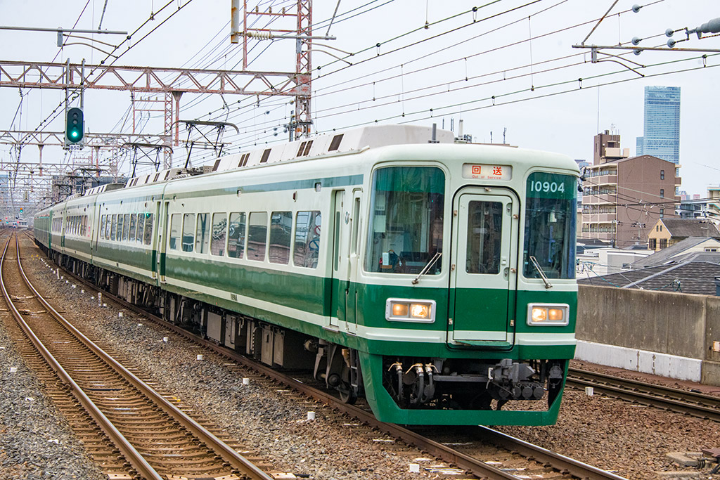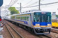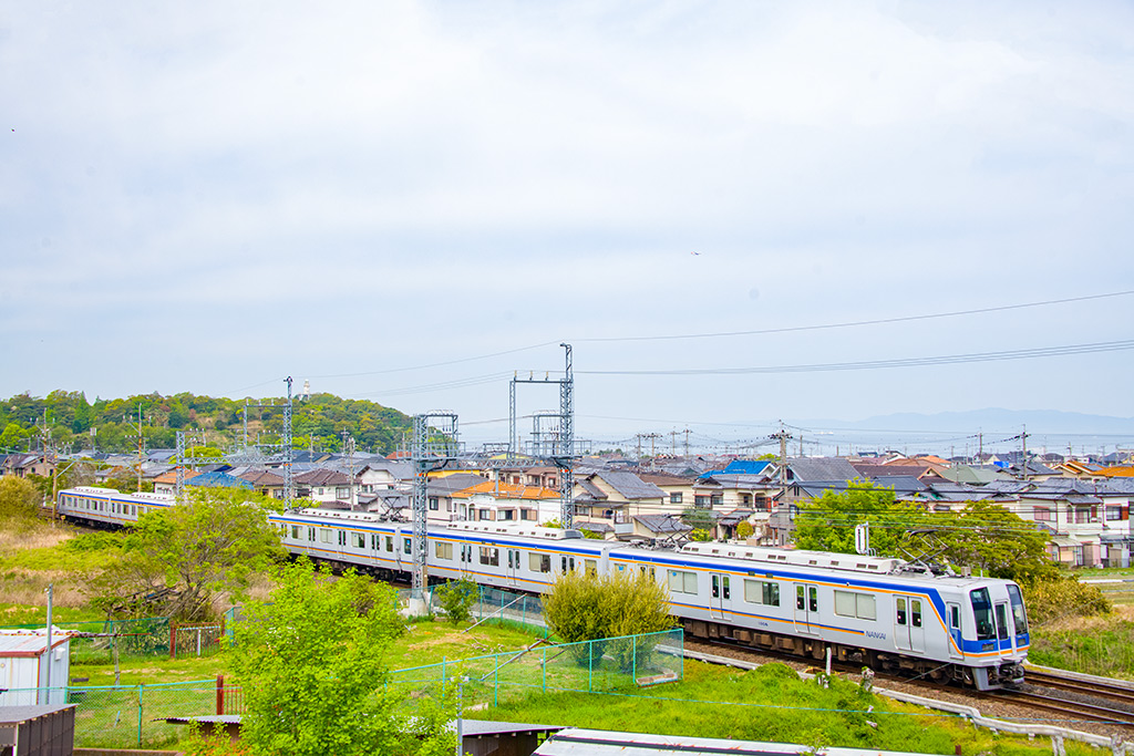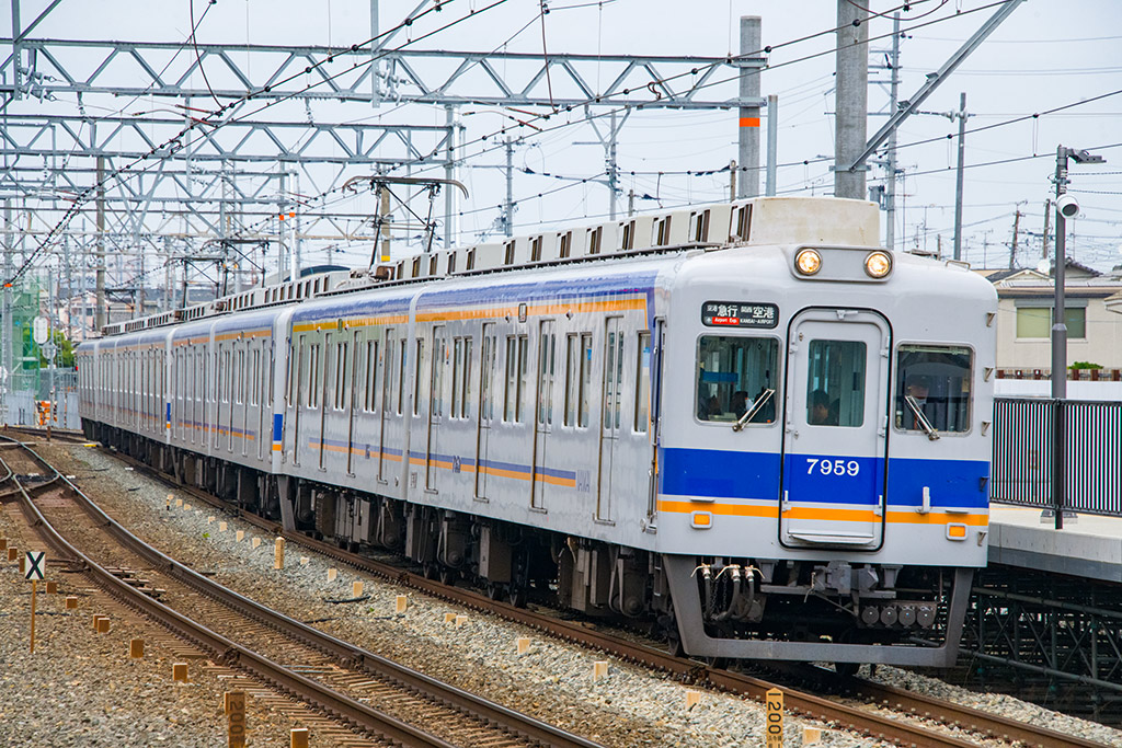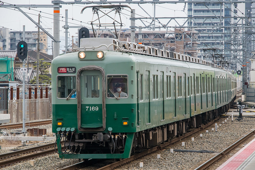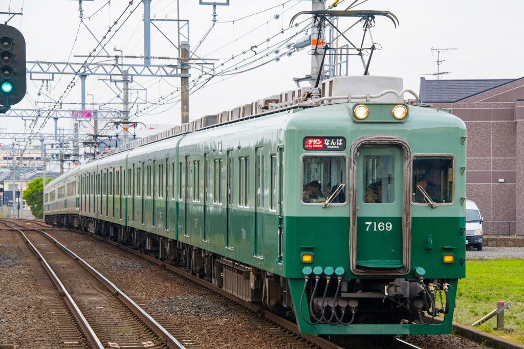 西陵古墳の横を通過する7100系車両(7169F(旧塗装リバイバル車両))+10000系車両(10004F(復元塗装))併結による特急サザン16号(0514)